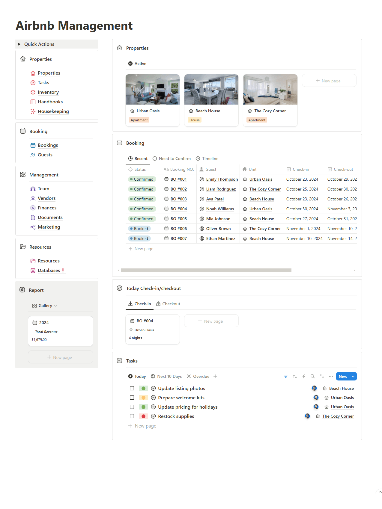 Urban Oasis, Beach House, The Cozy Corner each property as a full record with bookings, tasks, inventory, and housekeeping all linked.