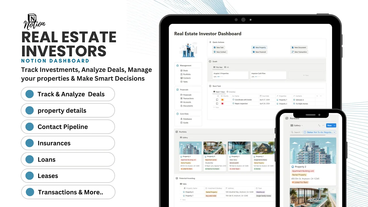 a complete overview of your investment portfolio and easy-to-use Notion tool. Track everything from finances and properties to leads and contractors
