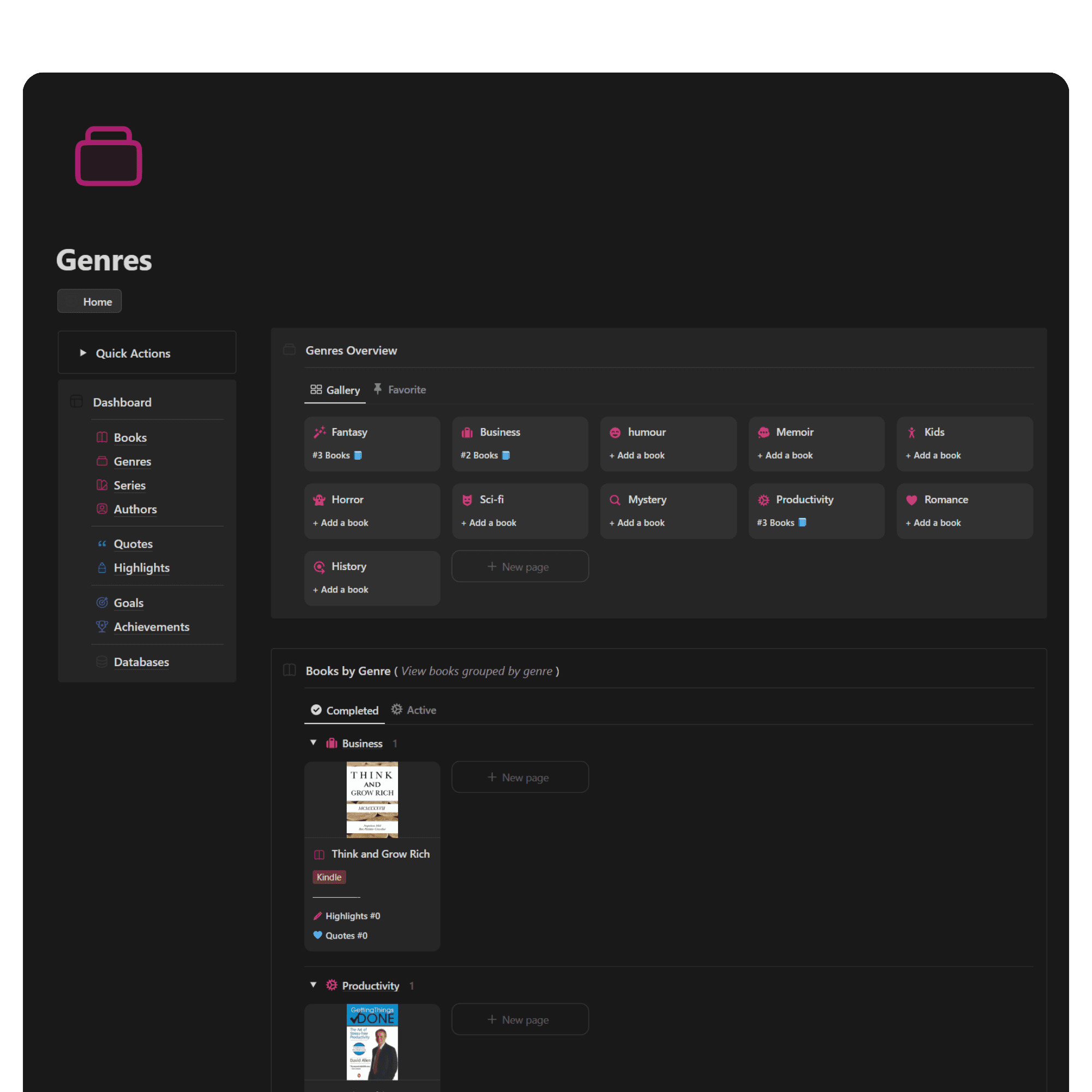Add favorite genres, track related books, and collect them by genre.