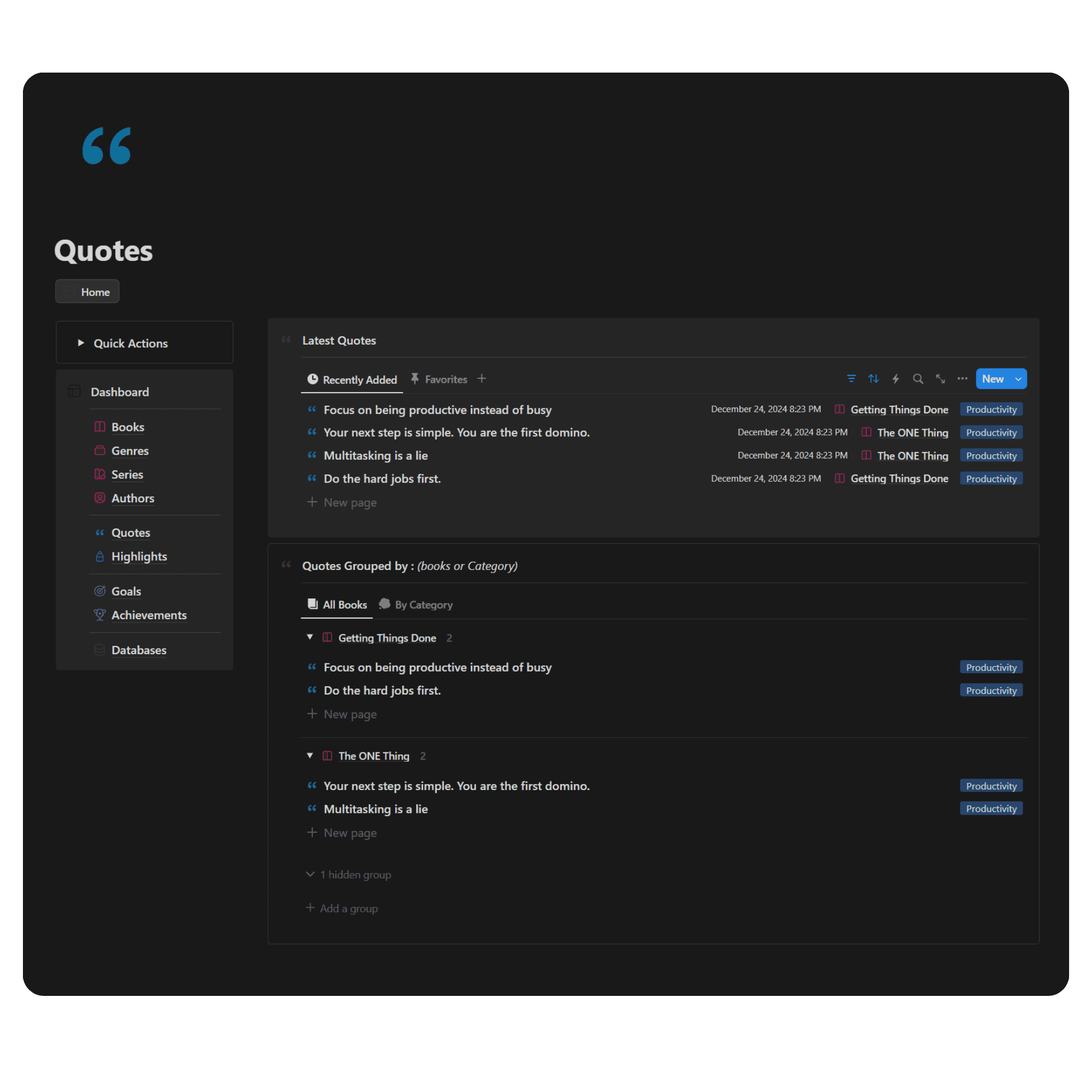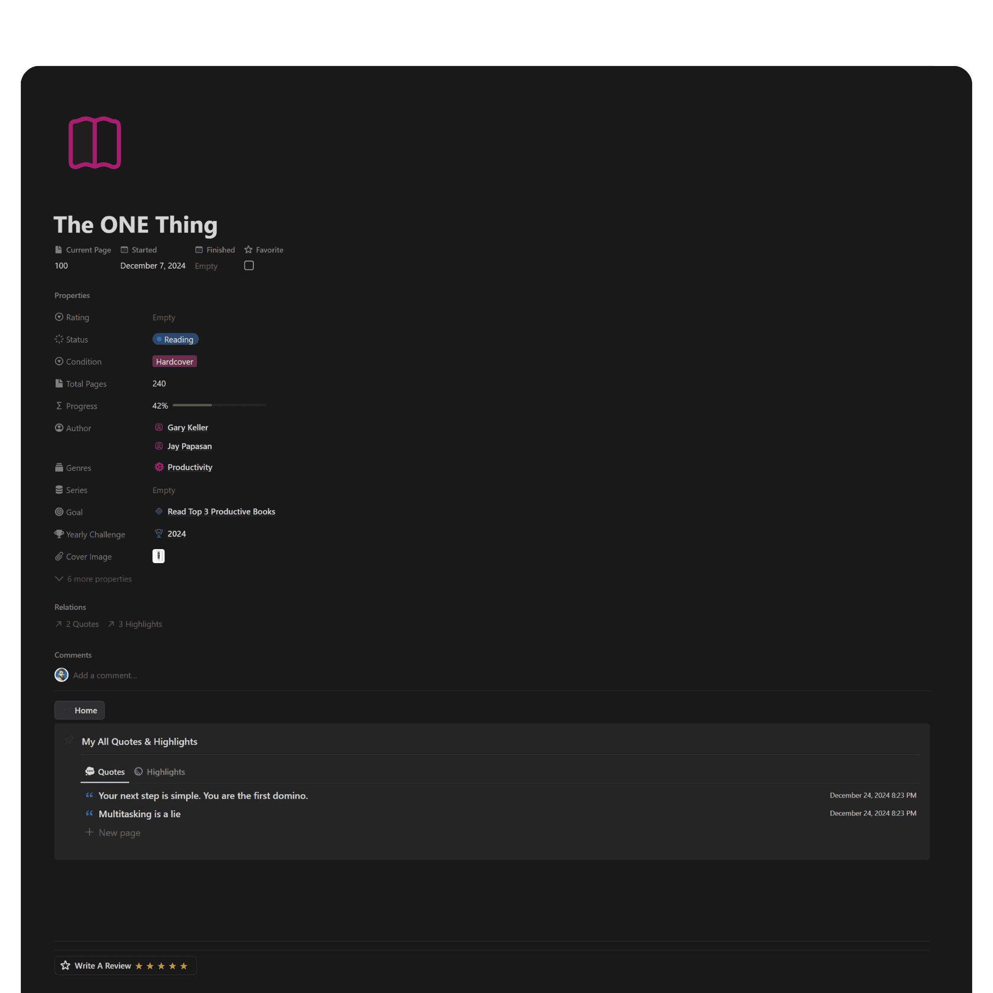 Dive deeper into your reading with pre-built template for each book. Effortlessly collect and organize your quotes and highlighted .A quick-button make it easy to add in-depth reflections and reviews for each book.