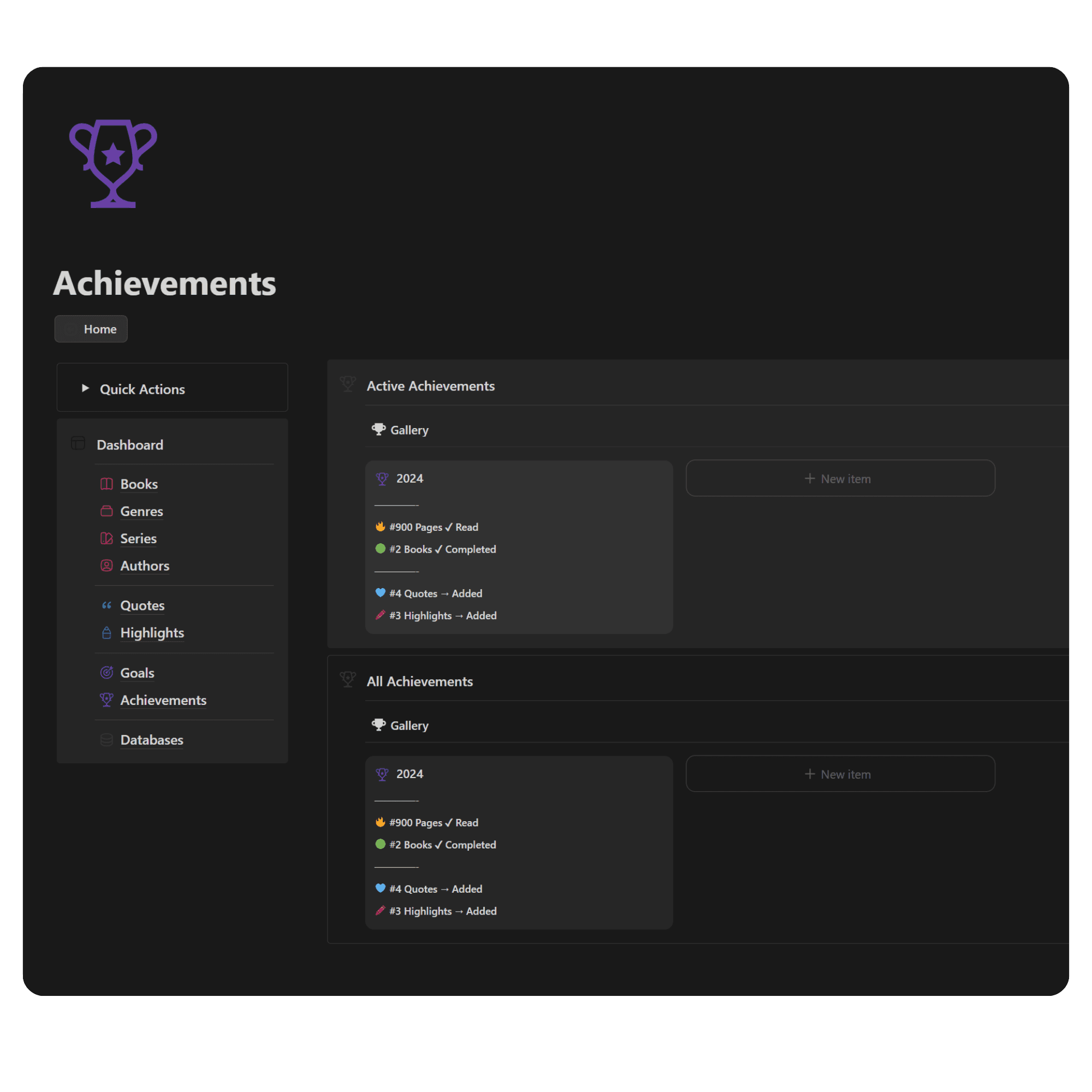 Celebrate your reading journey with this dedicated section. Track and visualize your progress, including pages read, books completed, and the number of quotes and highlights you've collected.