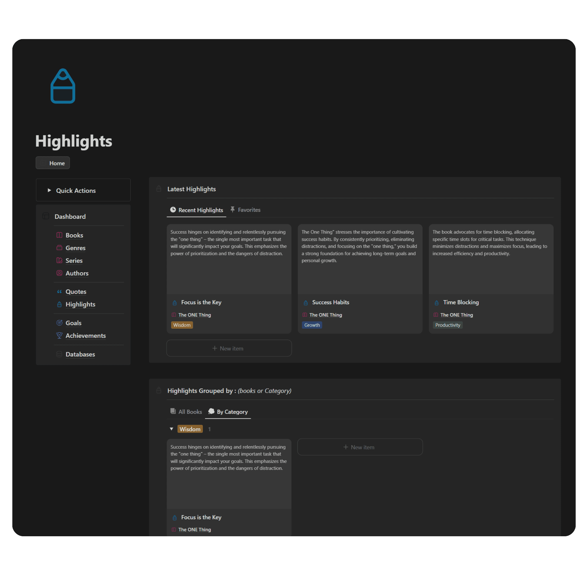 Capture, organize, and revisit the most impactful passages from the books you read. Easily add highlights, categorize them by book or theme, and revisit them for inspiration and reflection.