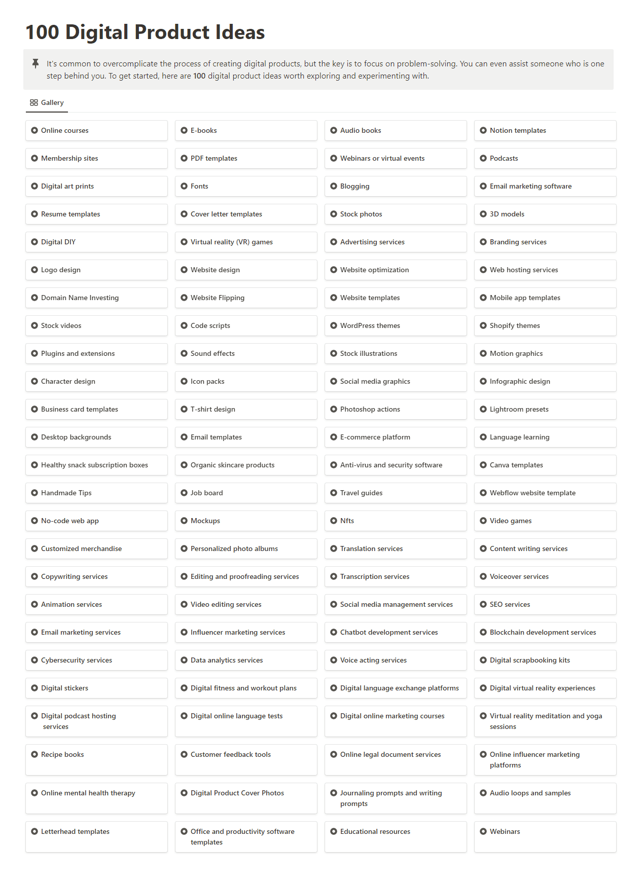 The Notion template "100 Digital Product Ideas" is a comprehensive guide to help you brainstorm and develop your own digital products. This template includes 100 unique ideas that can be used to create digital products.