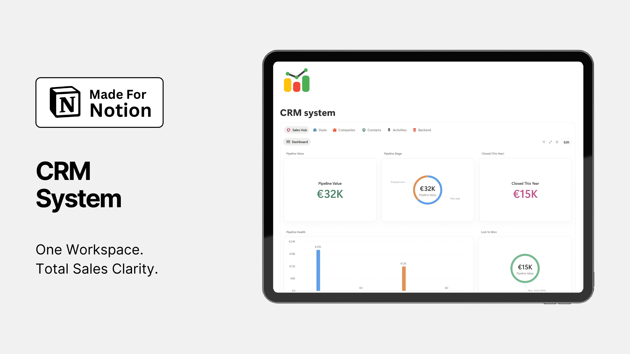 The Power Dashboard (Sales Hub): Real-time analytics showing your Pipeline Value (€32K), Pipeline Health, and Won vs. Lost ratios. Know exactly where your money is at a glance.